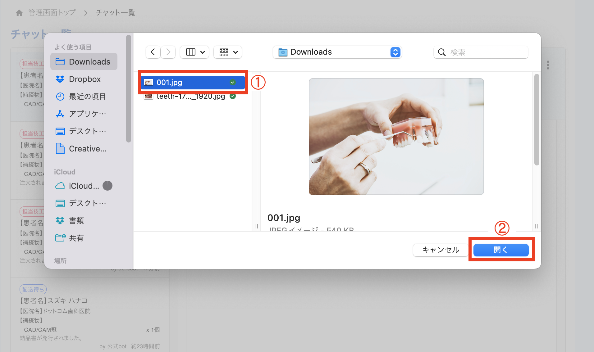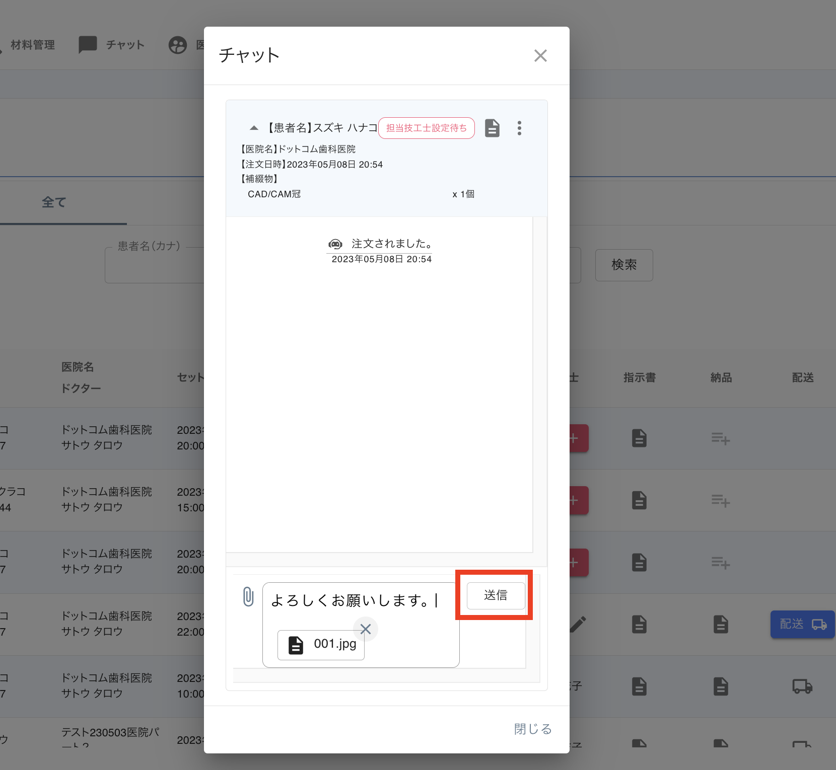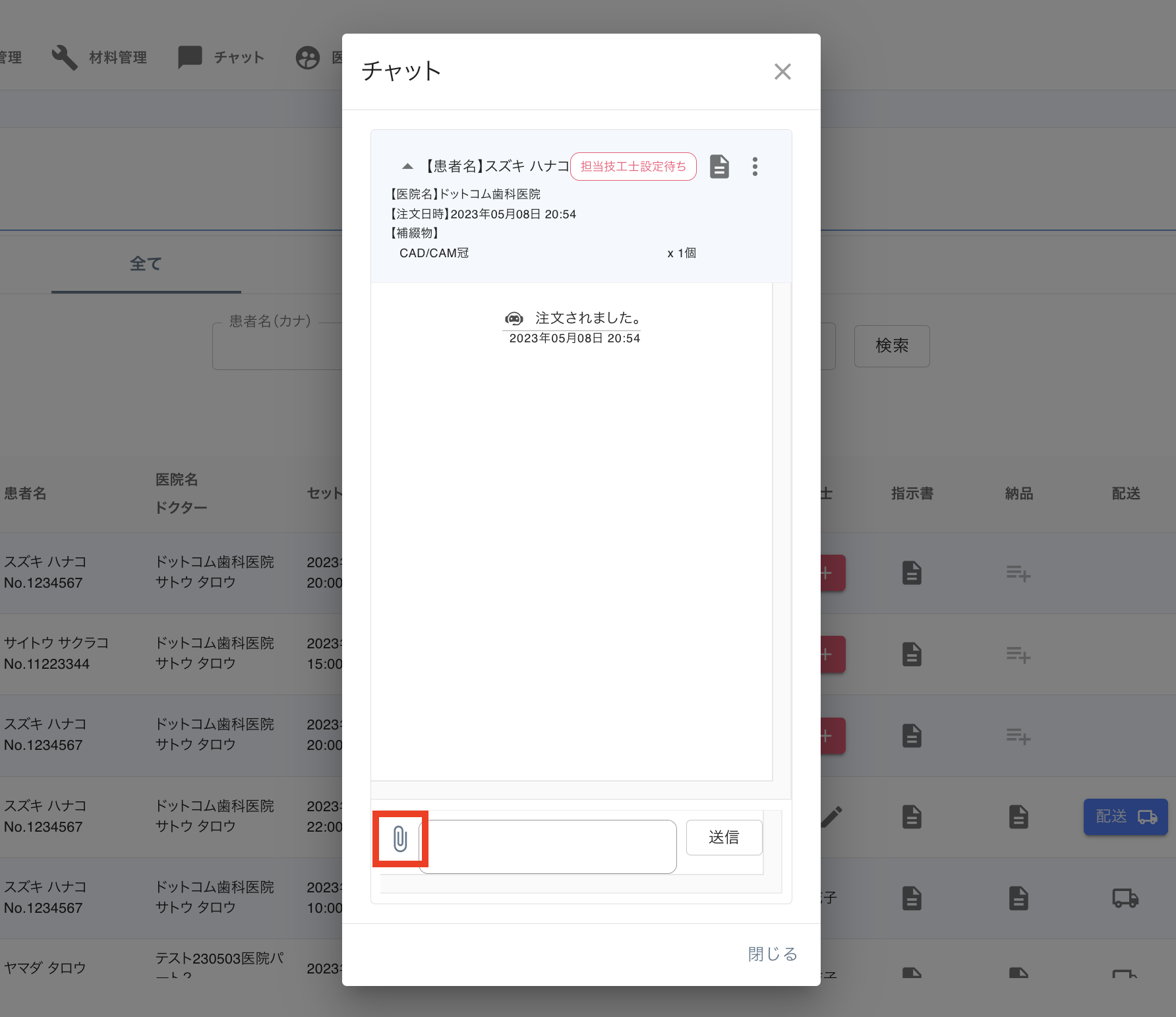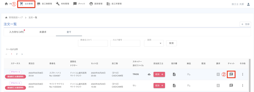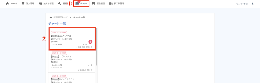 2. 連絡をしたいチャットを選択します。(歯科医院から注文されると、自動でチャットが追加されます。)