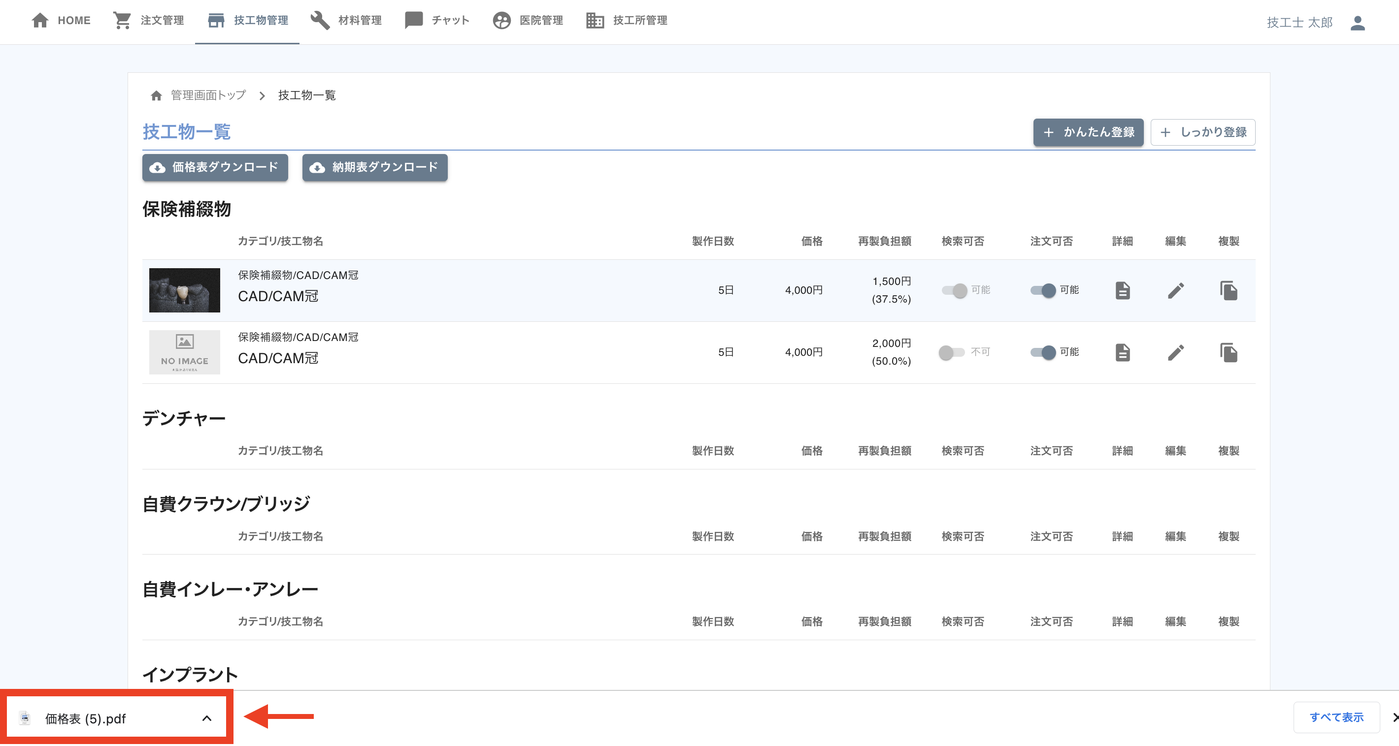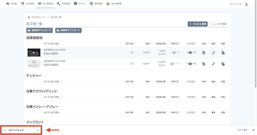 登録した技工物の価格表 / 納期表をPDFでダウンロード、または印刷をし、各歯科医院に送ることが可能です。
