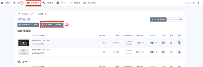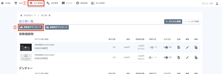 1. [技工物管理]をクリックします。