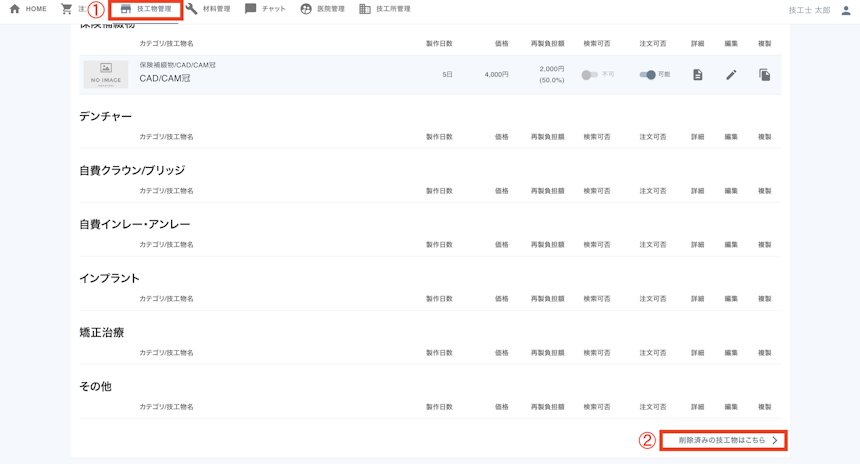 削除した技工物 / 材料を復活する概要間違えて削除してしまった技工物 / 材料を復活することができます。手順1. [技工物管理]をクリックします。2. 右下の「削除済みの技工物はこちら」をクリックします。3. 復活させたい技工物の「復活」アイコンをクリックします。