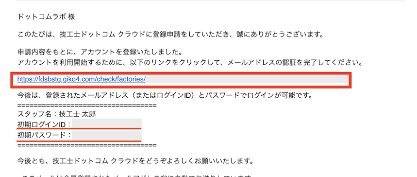 ※リンクの下に記載されている初期ログインIDと初期パスワードは、メールアドレス認証後の最初のログインに必要となる大事な番号となります。