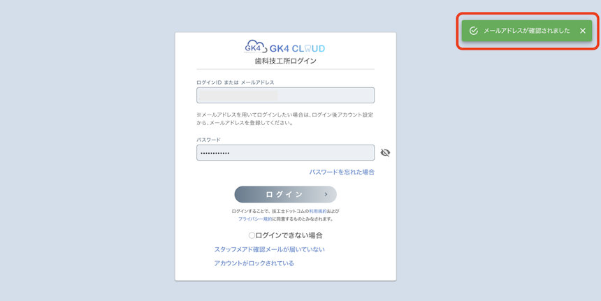 2. リンクをクリックすると【メールアドレスが認証されました。】と表示されます。認証が完了したら