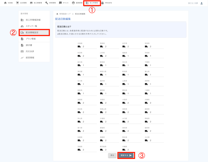 配送情報は、技工物が歯科医院に届くまでにかかる日数を設定するページです。歯科医院側にも反映される情報になります。