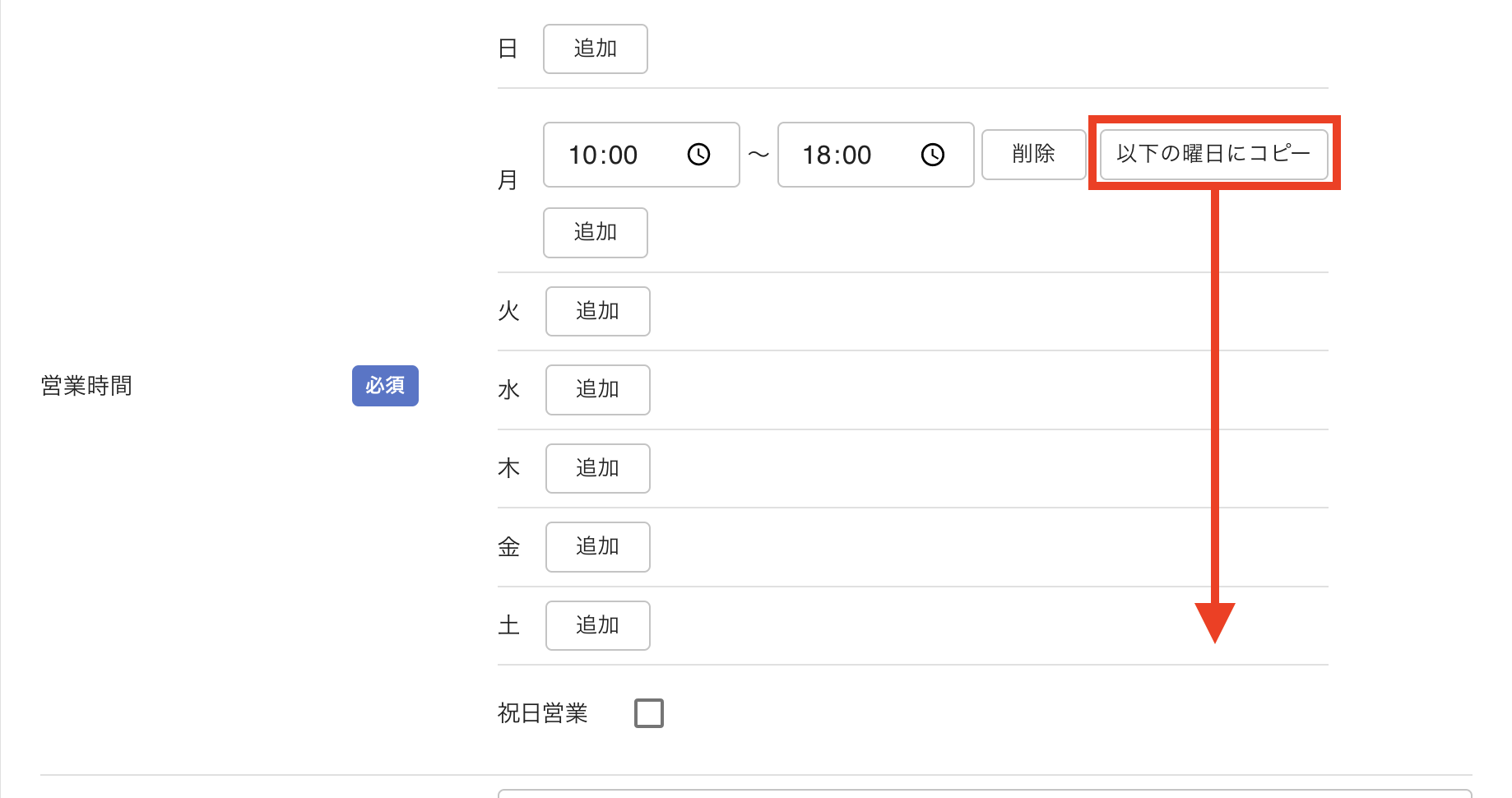 営業時間が同じ場合は、1つの入力項目に時間を入力した後、「以下の曜日にコピー」をクリックすると、火〜土曜日までに同じ時間が自動で追加されます。