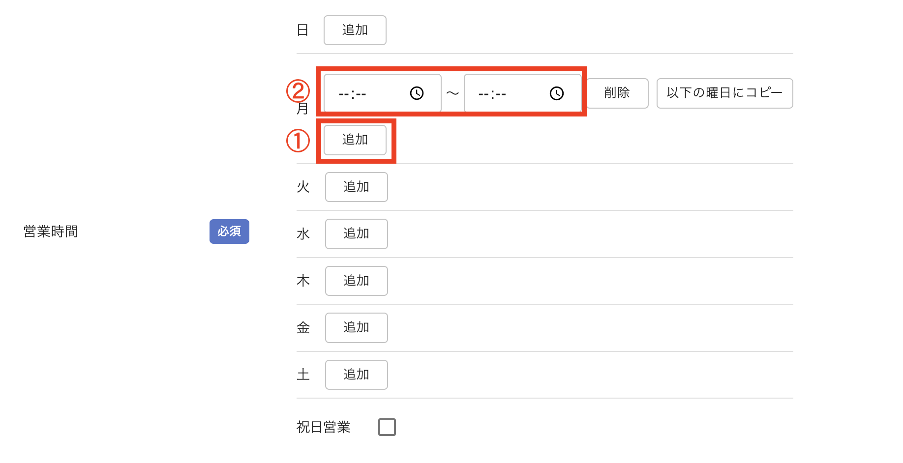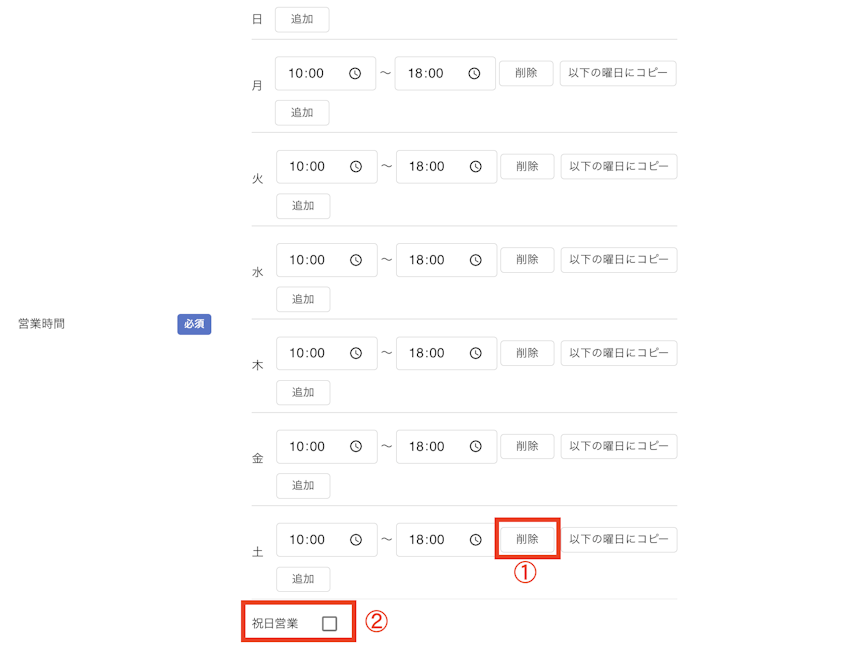 「追加」をクリックすると入力項目が表示されます。正確な営業時間を入力しましょう