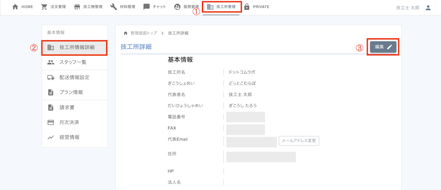 1. [技工所管理]⇨ [技工所情報詳細]⇨ 「編集」をクリックします。