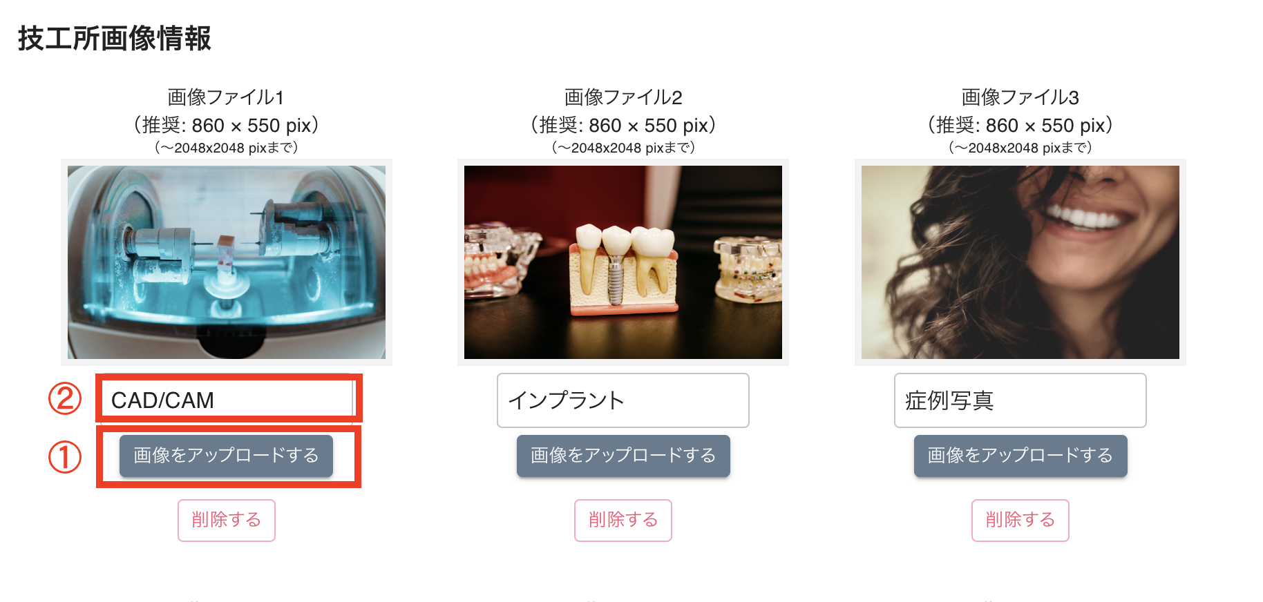 - 「画像をアップロード」することによって技工所の特徴が伝わりやすくなります。
