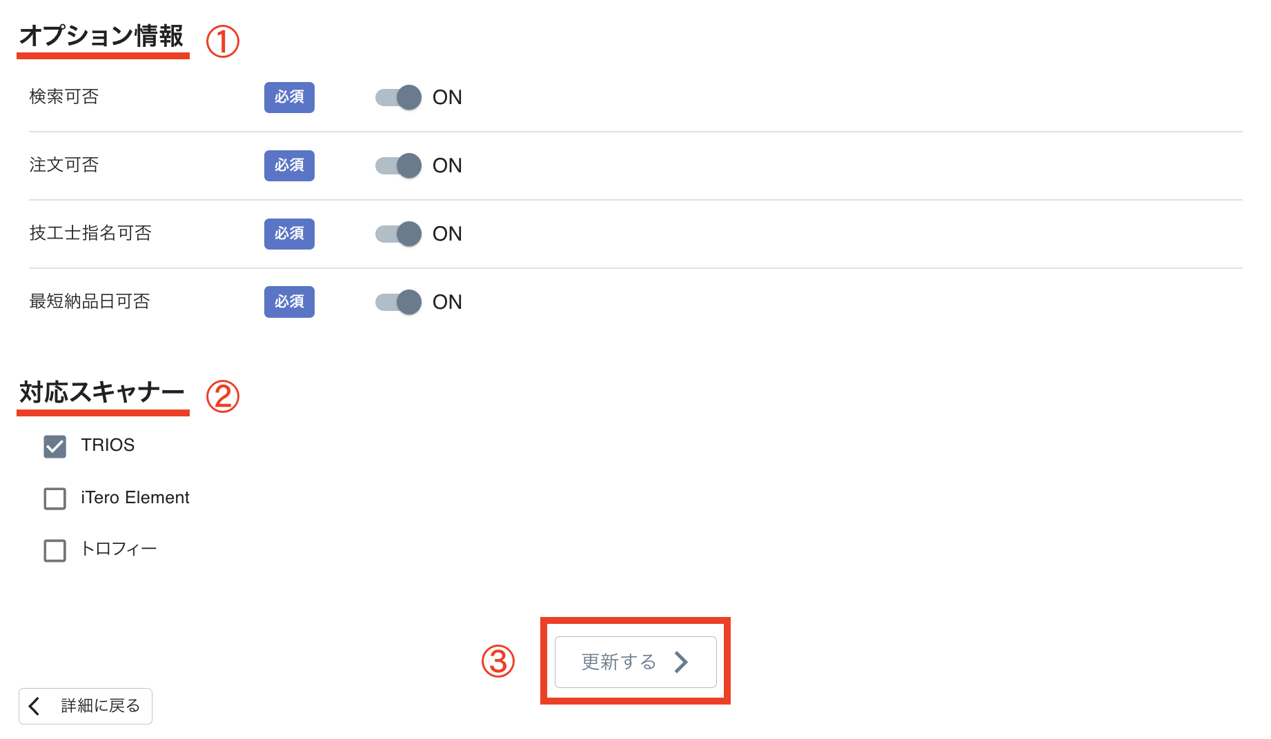 - 【注文可否】→注文を受け付ける / 受け付けないの設定ができます。技工物の登録が完了したら、必ずONに設定してください。