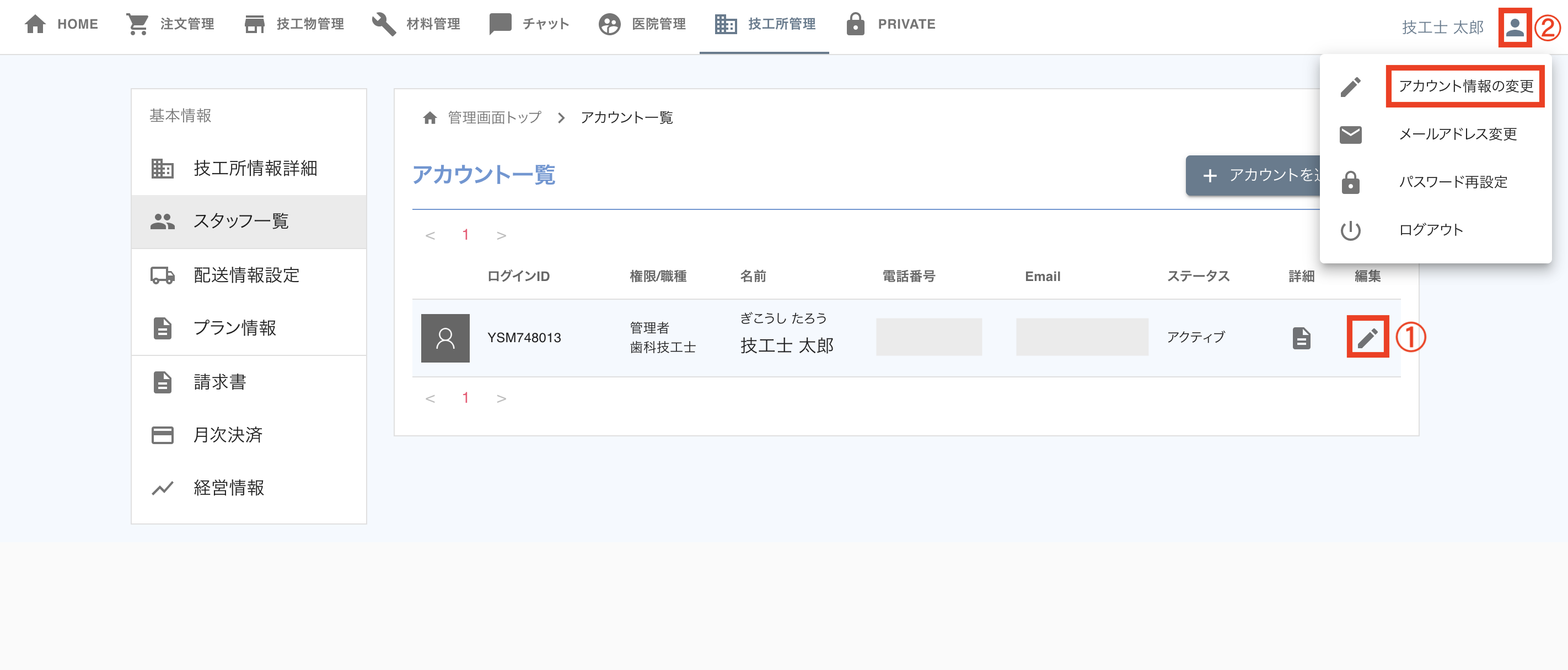 - 右上の「人アイコン」をクリック→アカウント情報の変更をクリックし変更する。