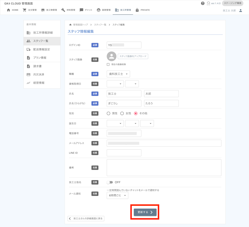 1. 新規アカウント登録が完了したら、管理者のプロフィールの作成画面が現れます。各項目に必要な情報を入力し、「更新する」をクリックします。
