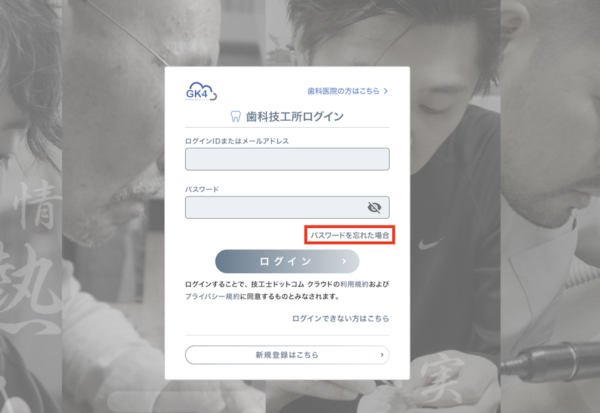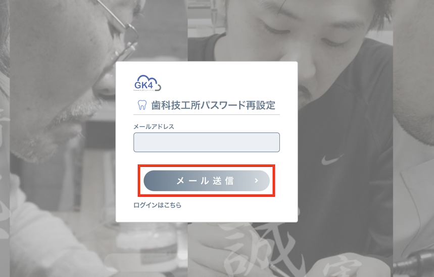 2. [歯科技工所パスワード再設定]画面でメールアドレスを入力して、「メール送信」をクリックします。