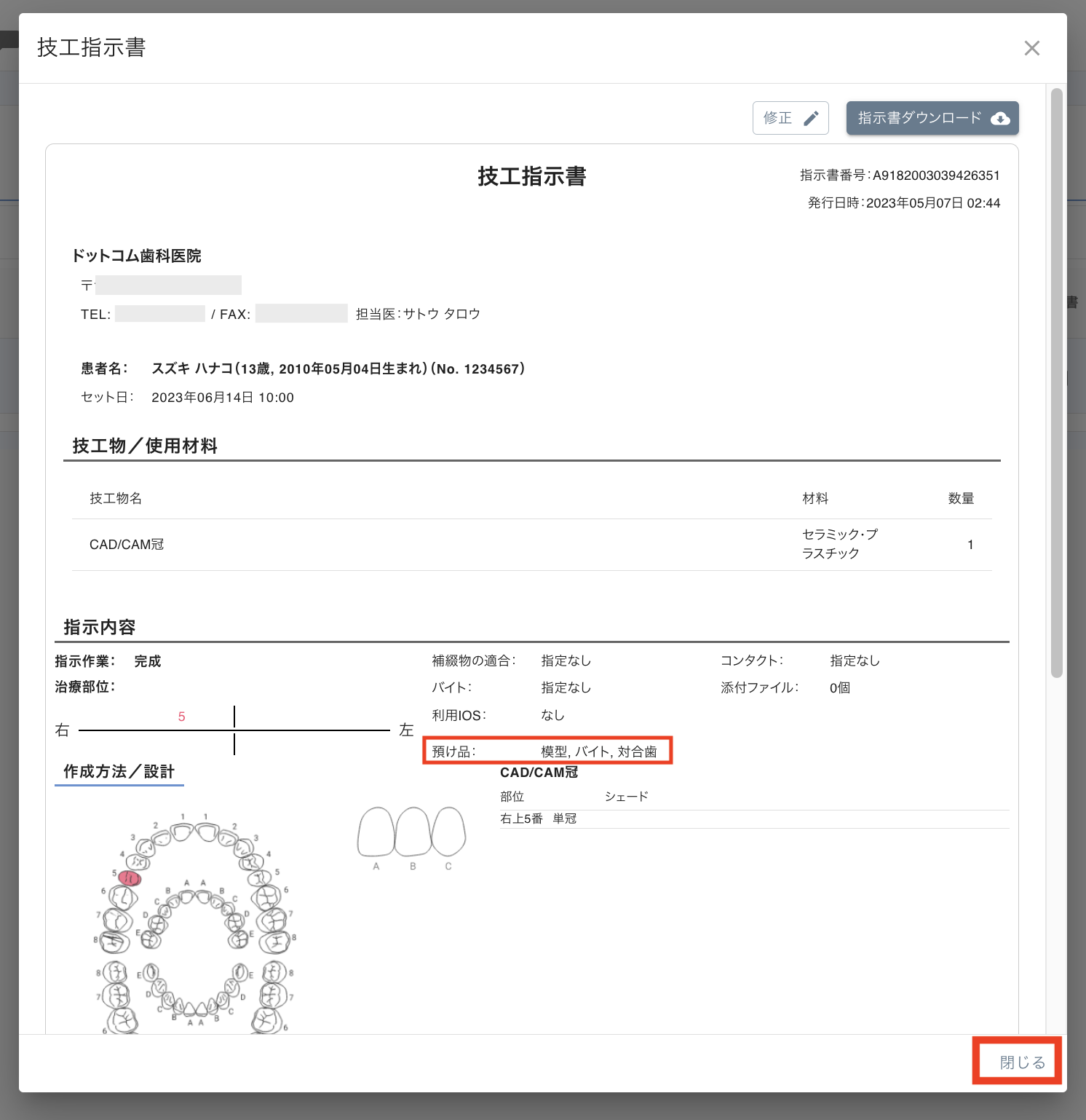 - 指示書に間違いがある場合は技工所側で修正することも可能です。詳しくは「 ECマニュアル(歯科技工所向け Private版) 」のヘルプページをご覧ください。