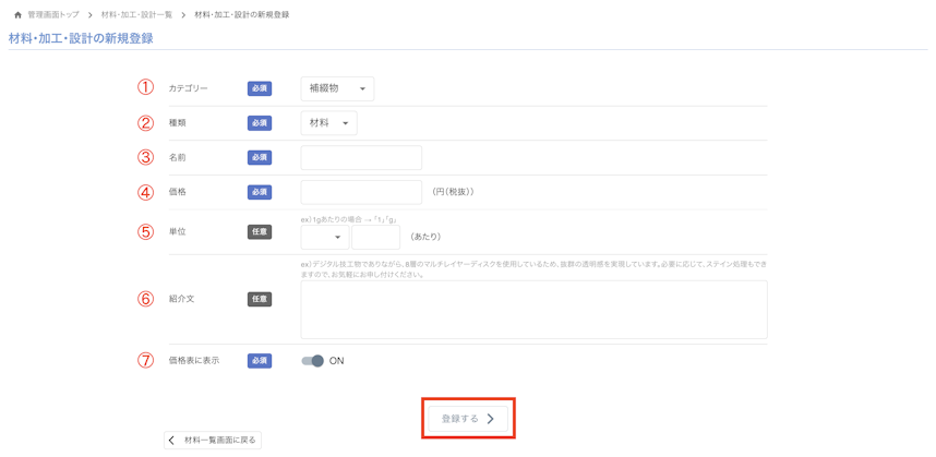 - 紹介文(任意)→材料に関する説明文を入力します。